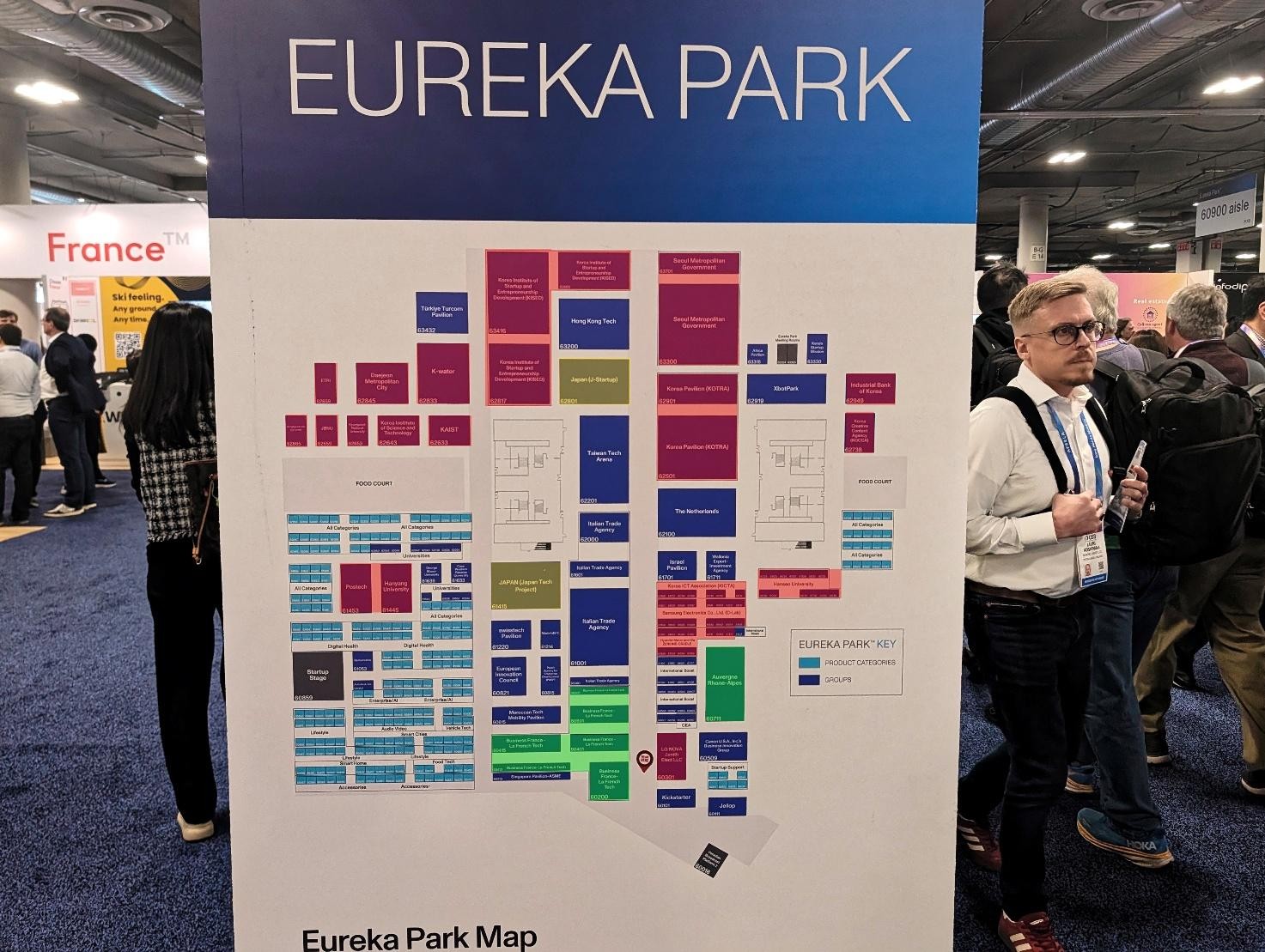 Eureka Park会場マップ。赤が韓国勢、緑がフランス勢、黄色が日本勢のブース。