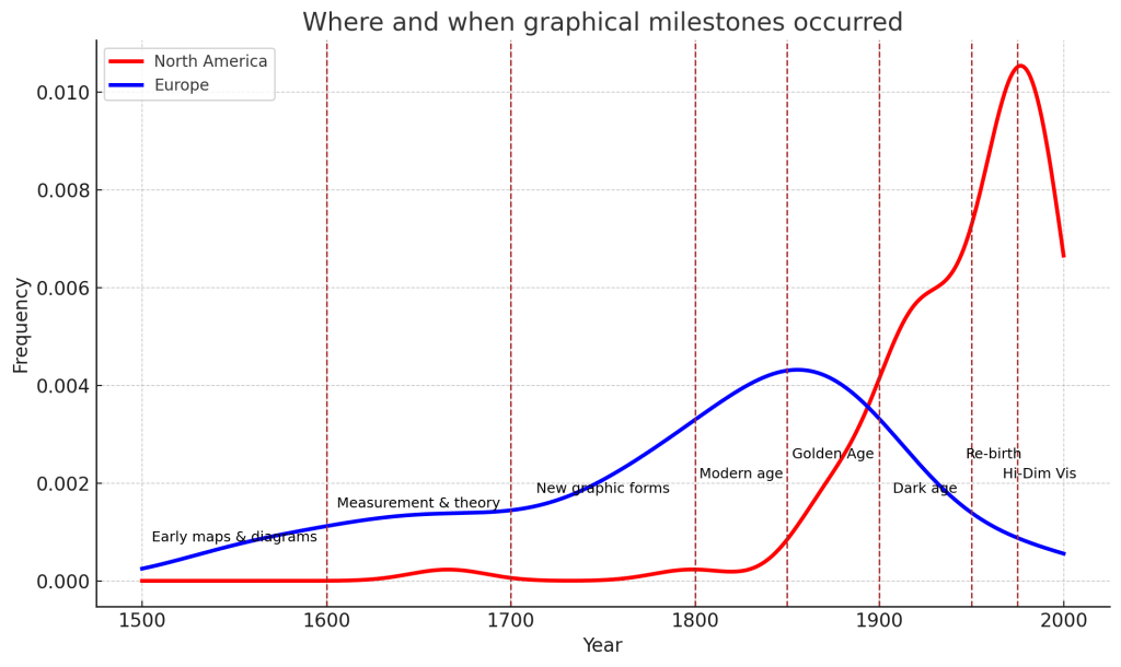 データ視覚化のイノベーションは以下のグラフの通り、1500年代からいくつかの段階に分かれて生じており、1800年代中ごろにヨーロッパでのピークが、1900年代後半に北アメリカでのピークが訪れています。