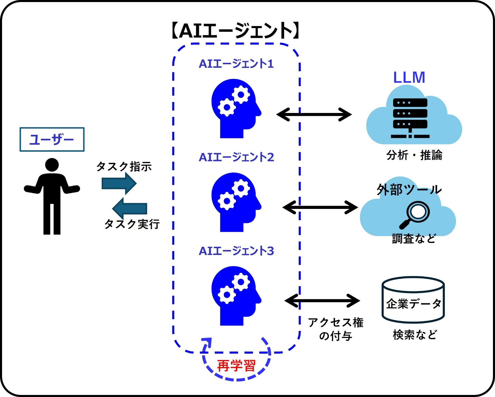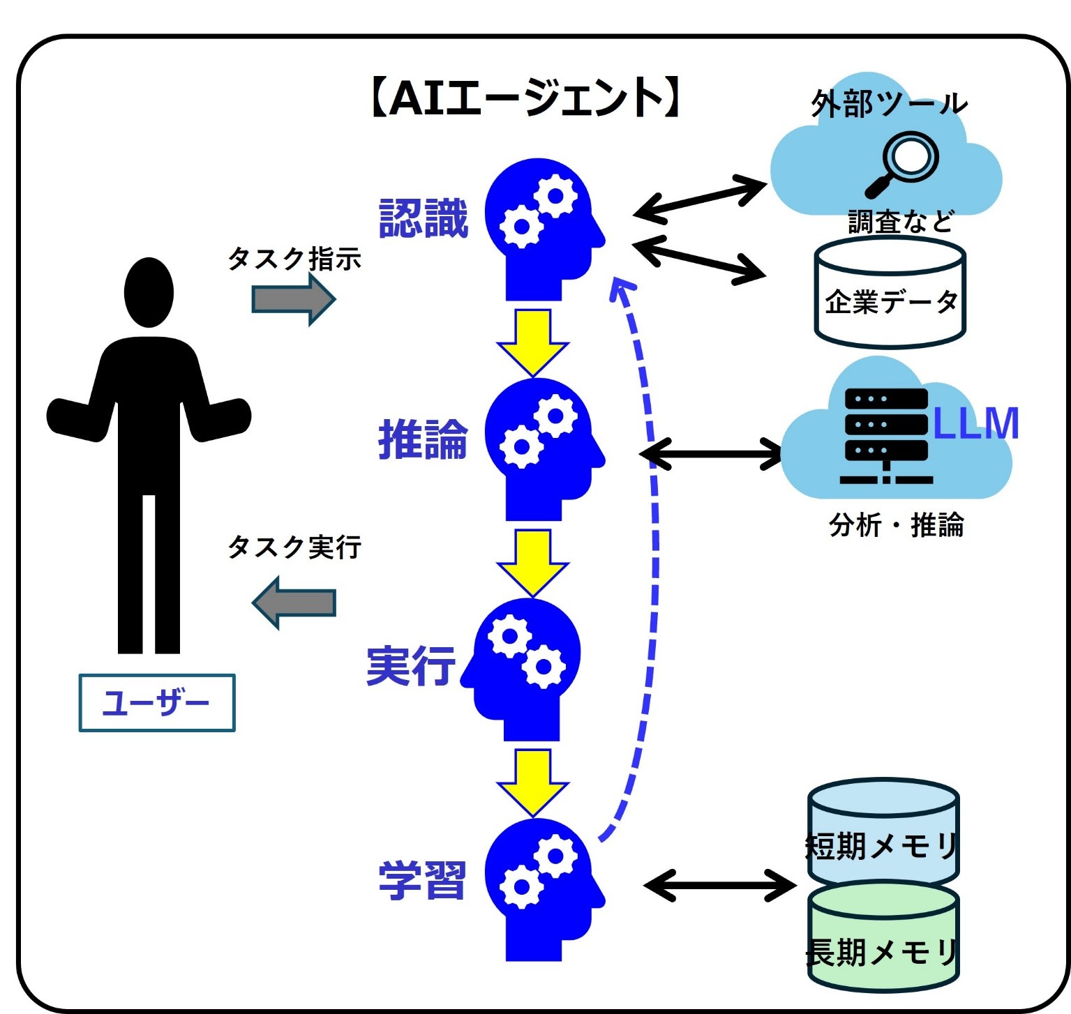 (4)Learn:学習:タスク処理の過程で得られたデータや結果を、フィードバックすることでエージェント自体をアップデートし、継続的にモデルを改善する。