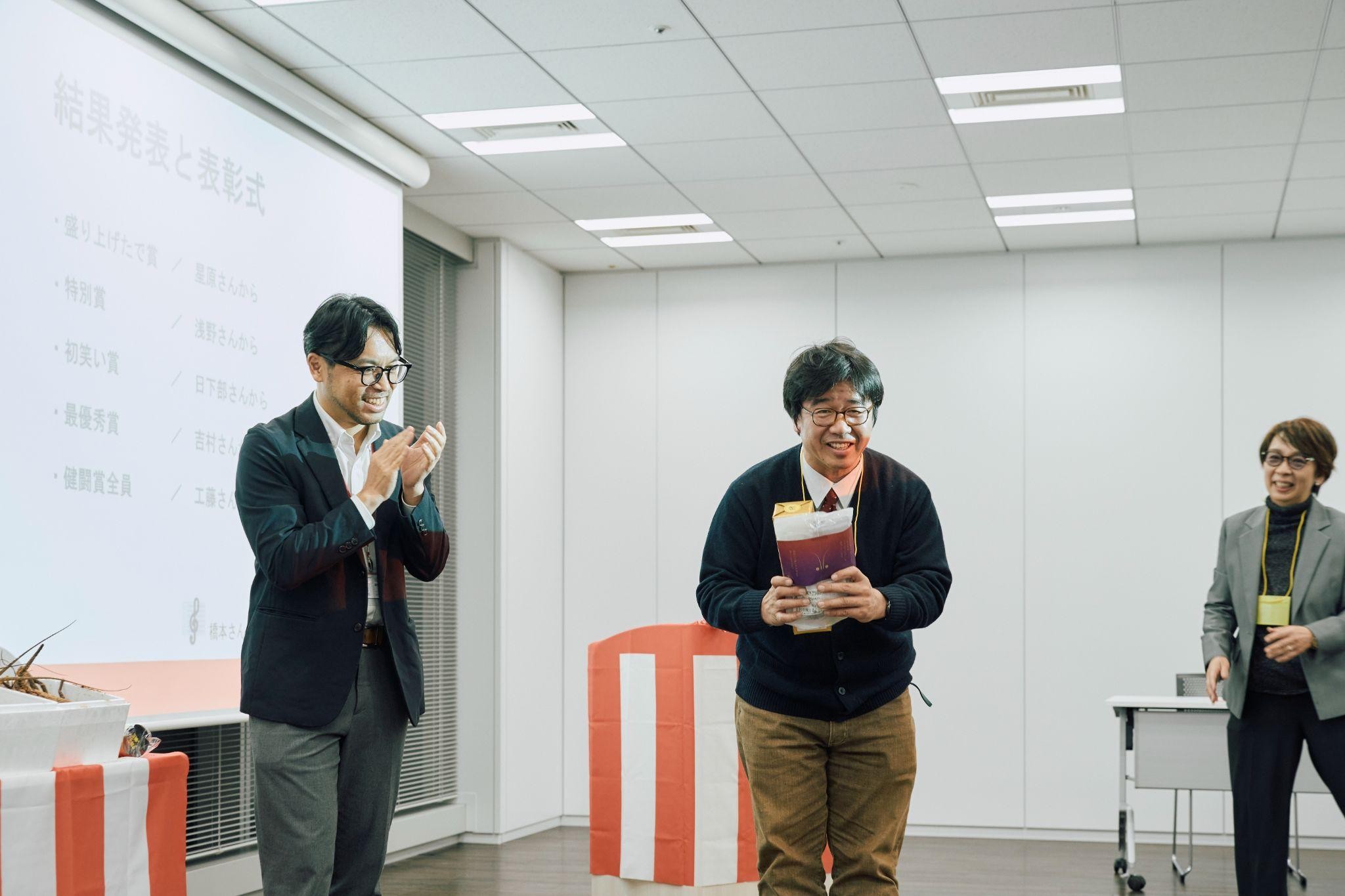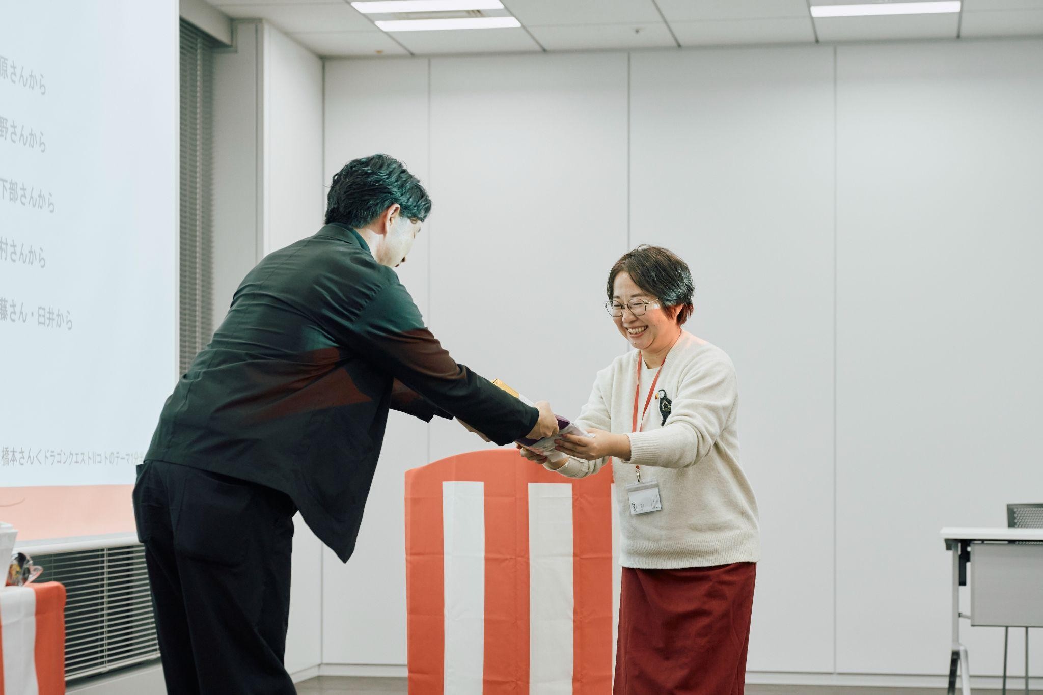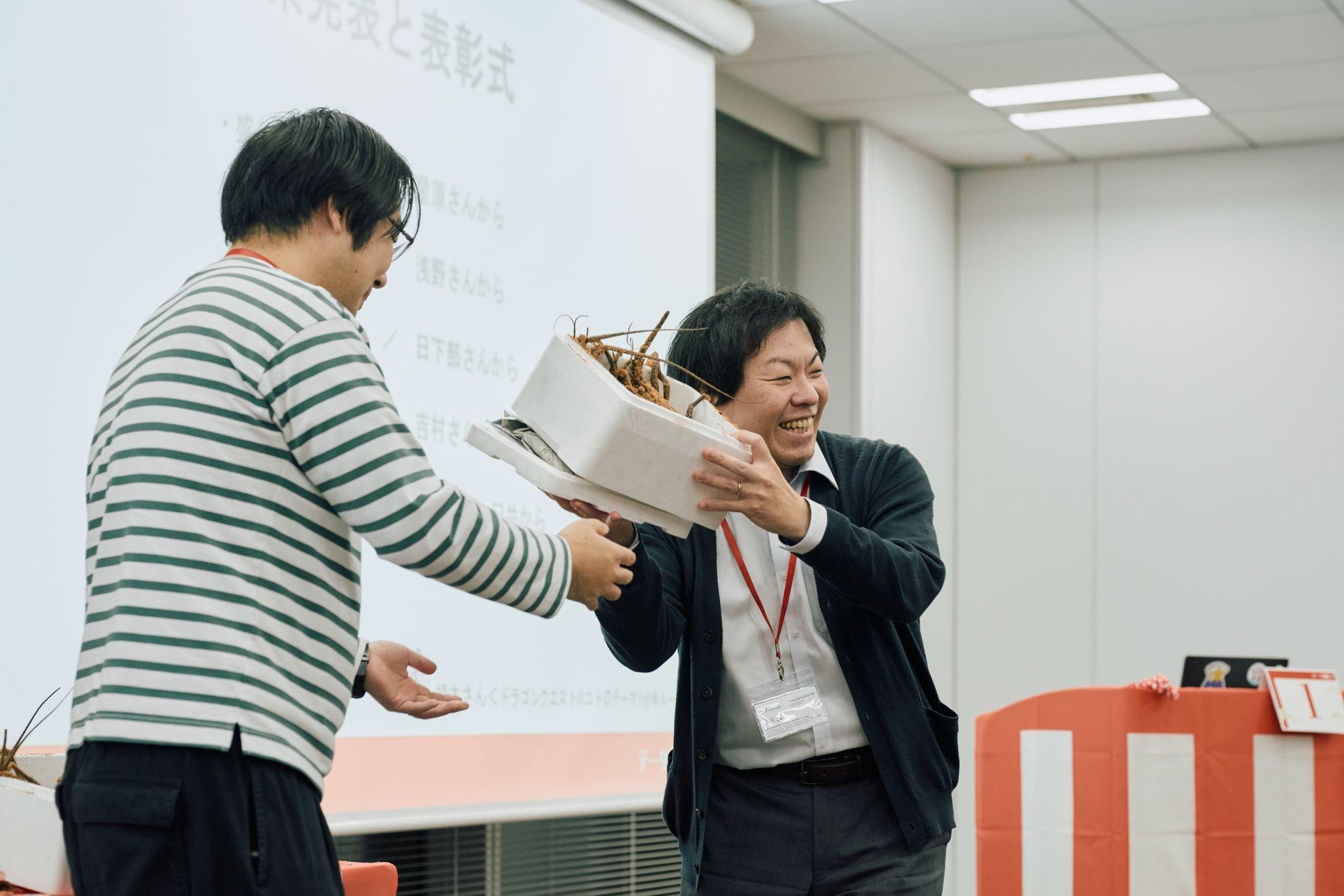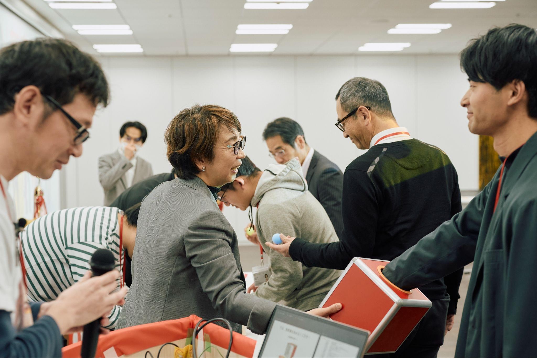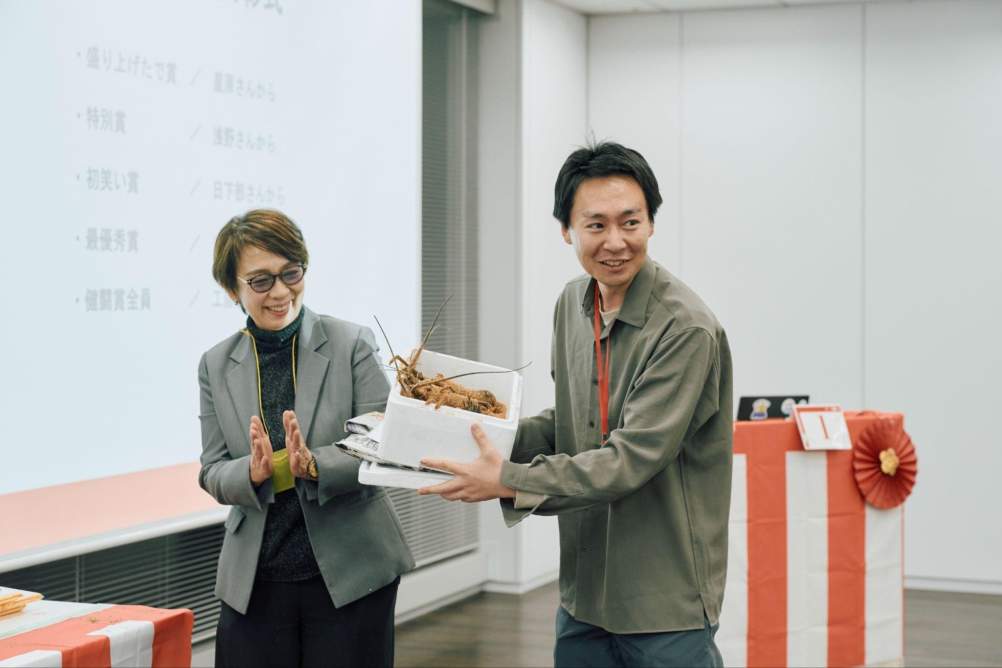 さらに会場全体を盛り上げた聴衆者にも、記念品が。投票時に積極的なフィードバックを記入した安藤さんには「盛り上げたで賞」として、極上金のカステラと伊勢海老せんべいが贈られました。