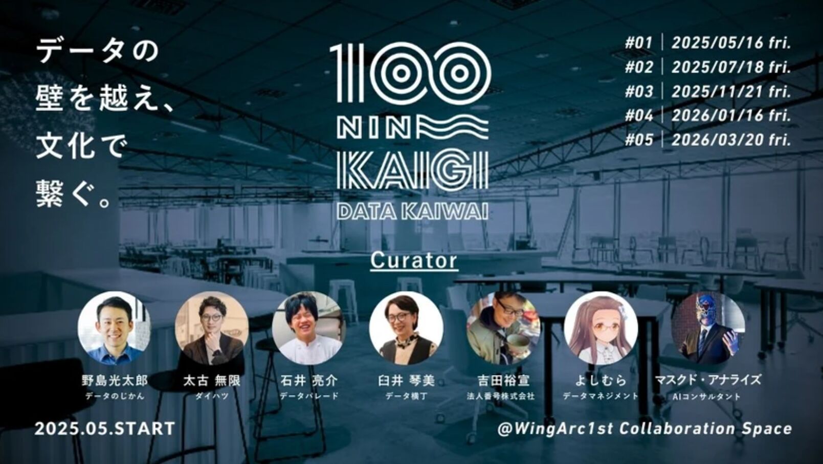 データの壁を越え、文化で繋ぐ。- データを捨てよ、町へ出よう! テクノロジーやDXの発展があっても、データの活用と価値創出には「人」と「文化」が不可欠です。そしてその2つが醸成される「場」も。 「データ界隈 100人カイギ」は、ITツールベンダー、コンサルタント、CDO、データサイエンティスト、エンジニア、ビジネストランスレーターなど、肩書や業界の垣根を越えた多様なデータに携わる方々がが一堂に会する「場」です。サイロ化された組織や断絶された知見を乗り越え、現場のリアルな声と出会いを通じて、新たな発見と連携を生む場作りを目指すイベントコミュニティです。データ界隈で活躍するキュレーターが、毎回テーマ、登壇者様をお招きし、組織、役職、立場、業界を超え、データ界隈の方々を繋ぐことを目的としたイベントです。