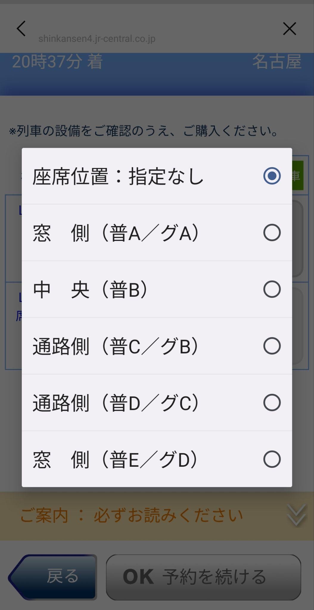 すると、列車予約のページが表示される。ここでの注意点は、座席表からの席指定はできない。「窓側(普A/グA)」「中央(普B)」などから、席を指定する。