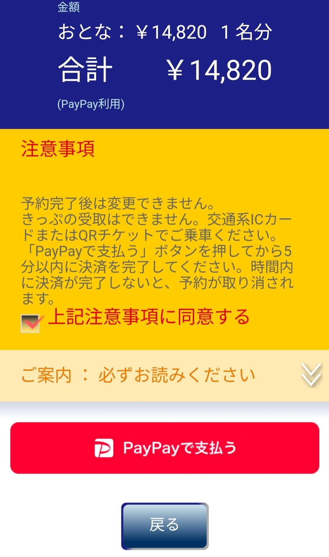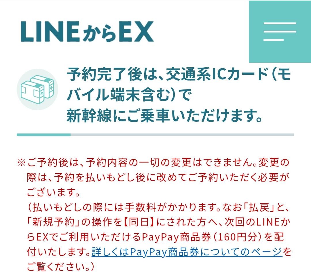 「LINEからEX」サービスを使用するにあたって、注意点がある。それは、「LINEからEX」での支払いはPay Payのみである。Pay Payに残金が残っていない場合は、事前にチャージすることをおすすめする。私も事前にチャージした。