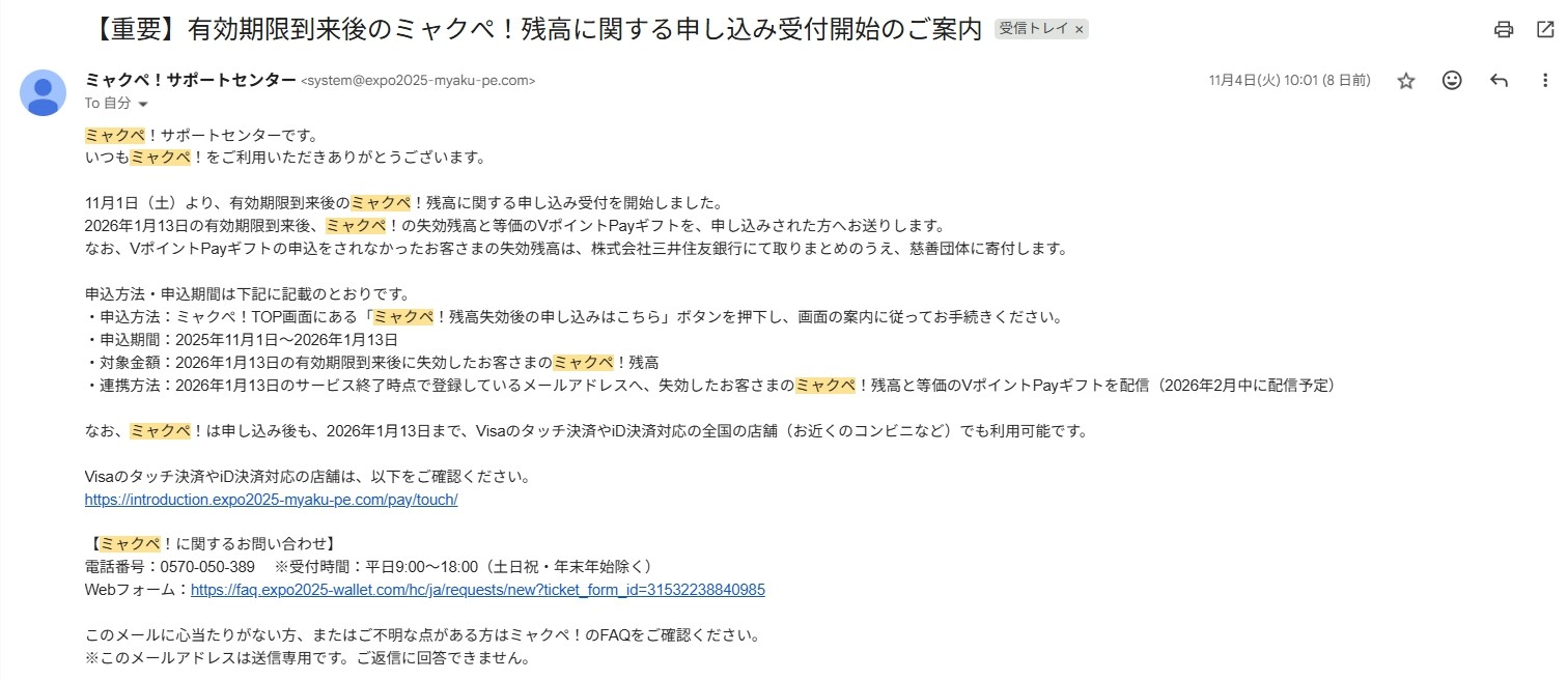 11月初旬にミャクぺの残高処理の告知メールを受け取った。