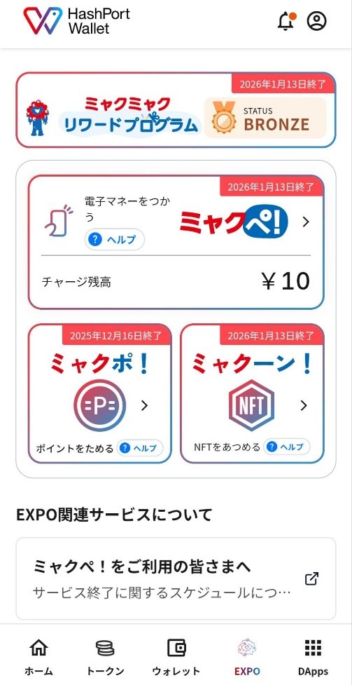 残高処理はアプリ「HashPort Wallet」(旧名EXPO2025デジタルウォレットアプリ)から行う。「ミャクぺ!」をタップし、続けて「ミャクぺ!残高失効後の申し込みはこちら」をタップする。