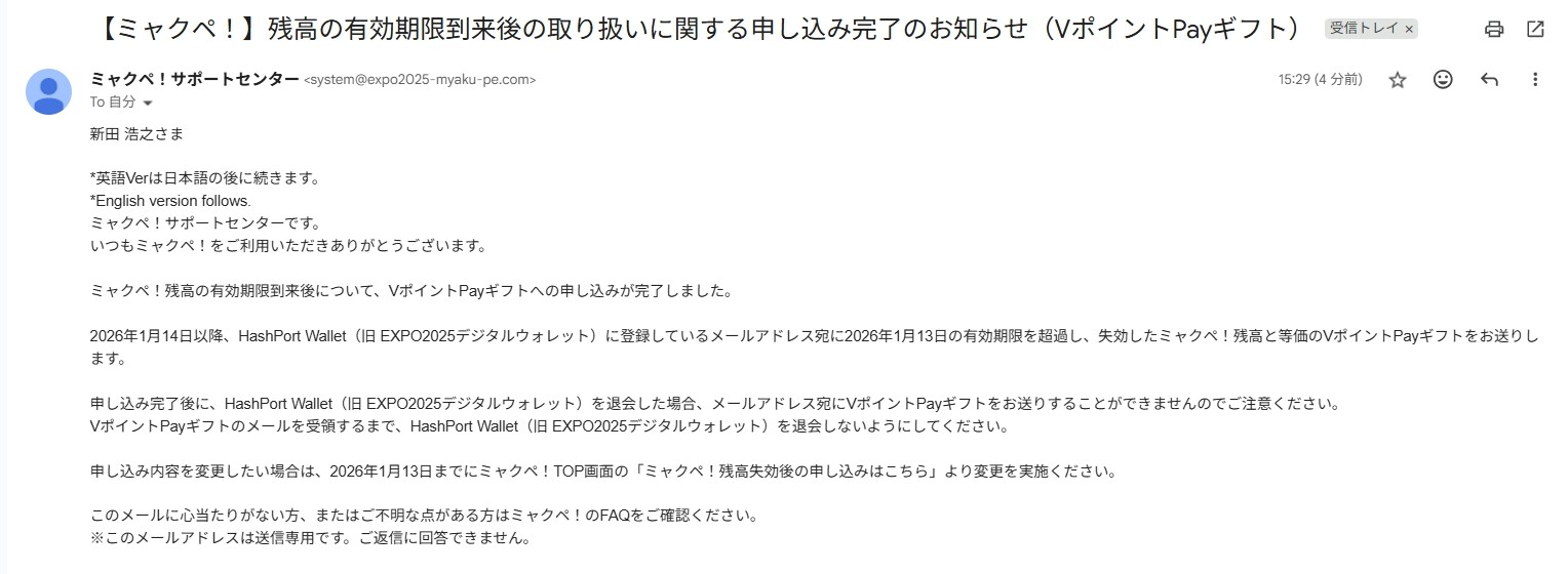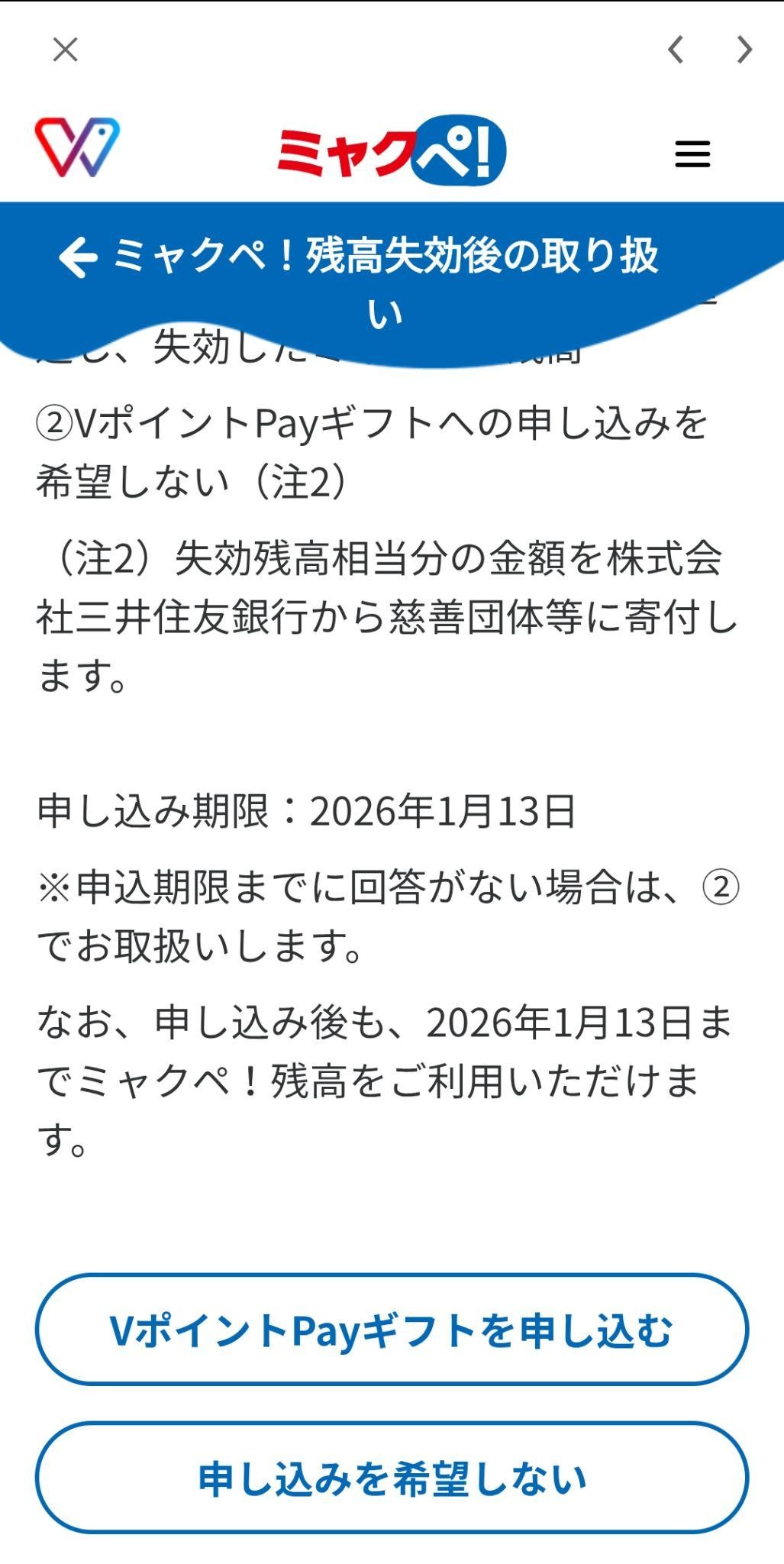 「失効」と聞いて驚くかもしれないが、慌てる必要はない。ミャクぺ!サポートセンターでは、2026年1月13日まで、ミャクぺ残高に関する申し込みを受け付けている。申し込みをすると、失効残高と同額のVポイントPayギフトが送られる。