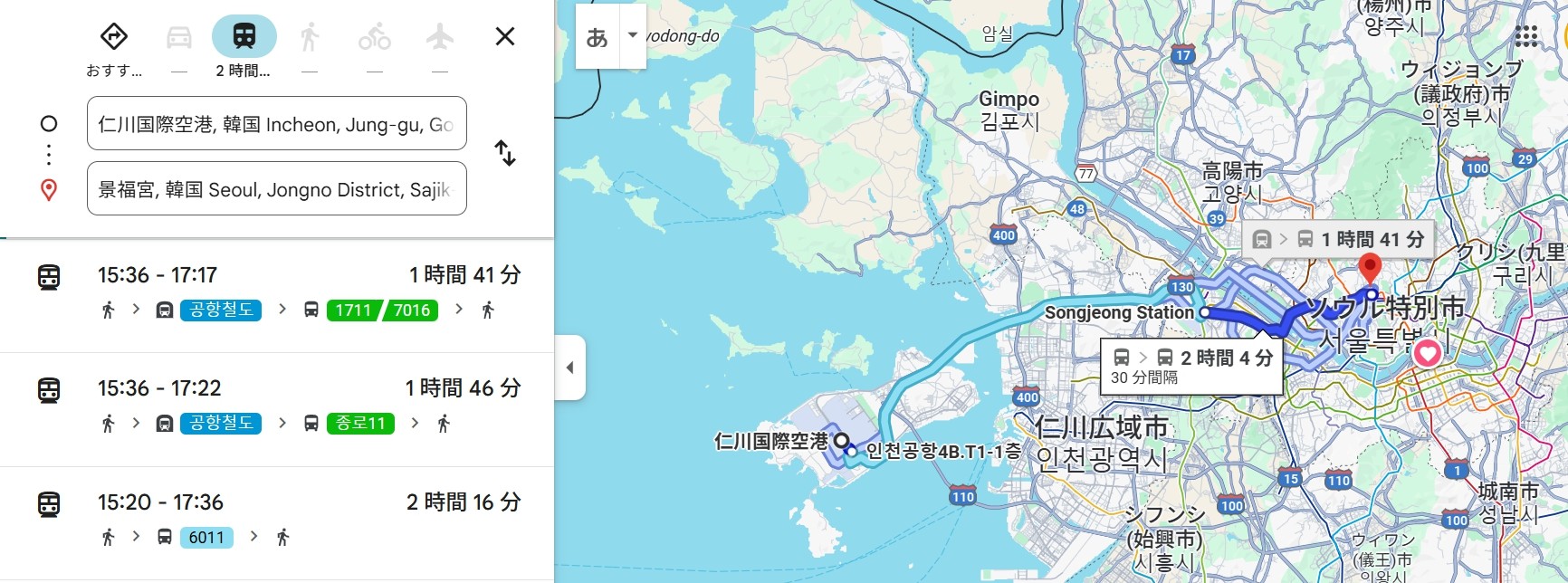 仁川国際空港からソウル中心地にある景福宮までのアクセス方法をグーグルマップで調べてみた。すると、所要時間は「1時間41分」と表示された。しかし、韓国の情報サイトを見ると、仁川空港から景福宮までは約1時間と明記されている。