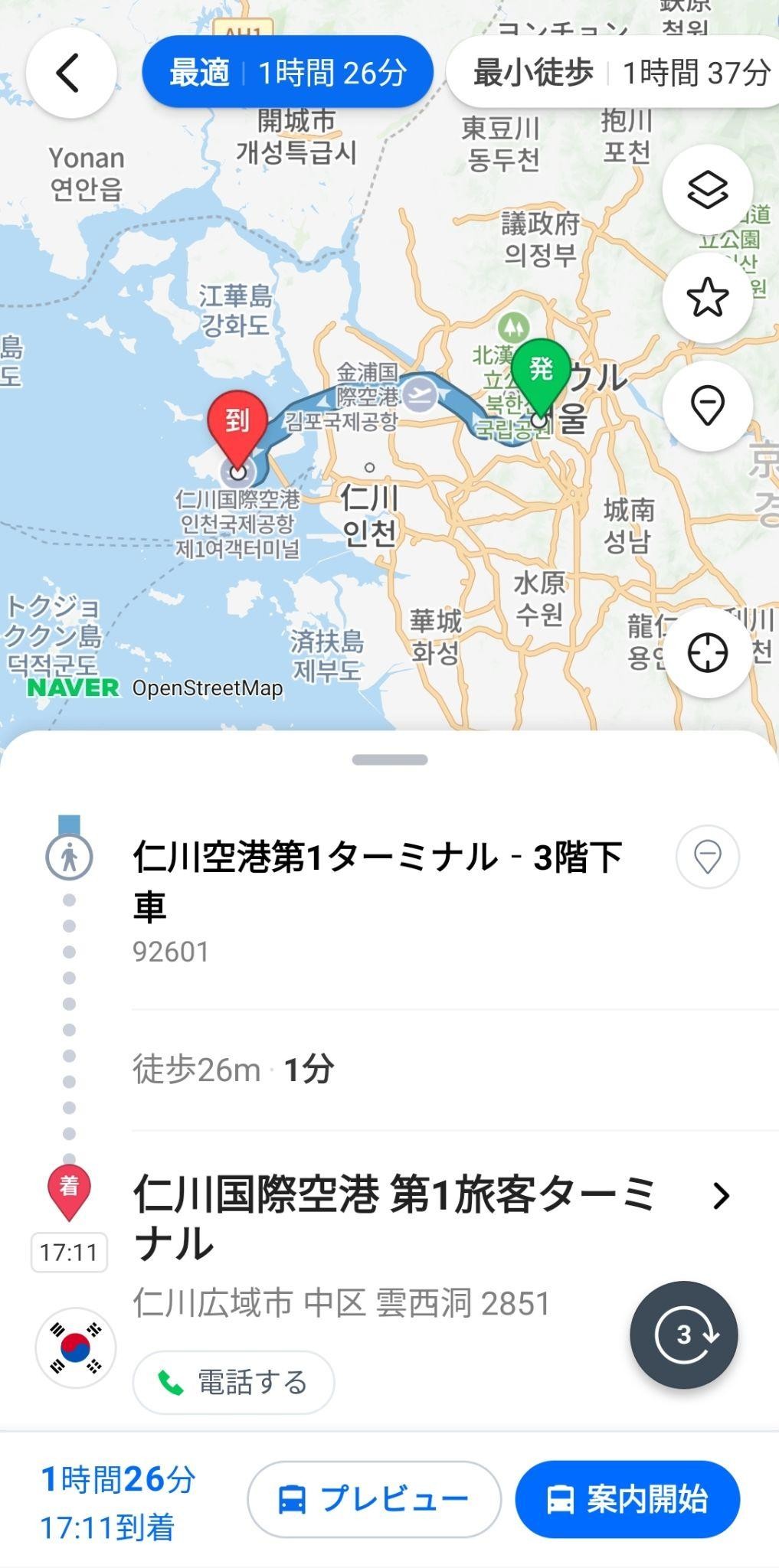 次は韓国で最も利用者数が多いと言われているマップアプリ「NEVERマップ」で調べてみた。すると、仁川空港から景福宮までは1時間11分、先述したバーから仁川空港までは1時間26分であった。NEVERマップでは、仁川空港ターミナルバス停から仁川空港第1旅客ターミナルまでは徒歩1分とのこと。どのように考えても、韓国ではグーグルマップより、NEVERマップの方が使える。