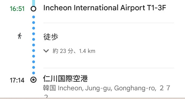 また、ソウル中心地にあるバーから仁川空港までの所要時間は1時間36分だ。しかし、おかしいことに、仁川空港バス停から仁川空港まで「徒歩23分」と表示され、ここで違和感を持った。