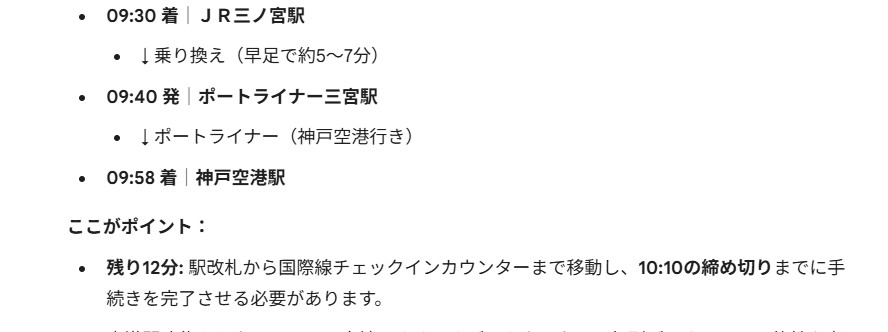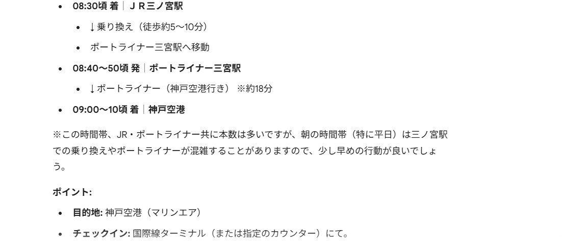Geminiは、JR三ノ宮駅に8時30分頃に着くプランを提案した。神戸空港には9時~9時10分頃に着く。大韓航空便が発車する2時間前に神戸空港に到着する感じだ。国際線の場合、発車2時間前に空港に到着することが常識となっているため、このような提案をしたのだろう。