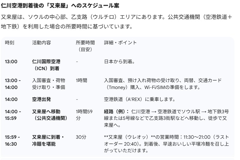 プランニングは入国審査や荷物受け取りの時間も考慮されている。空港から「又来屋」までは2時間を要するとのことだ。ここで、疑問が湧いた。「仁川空港からソウル市内までは1時間くらいだったはず。2時間はかかりすぎなのでは」と。