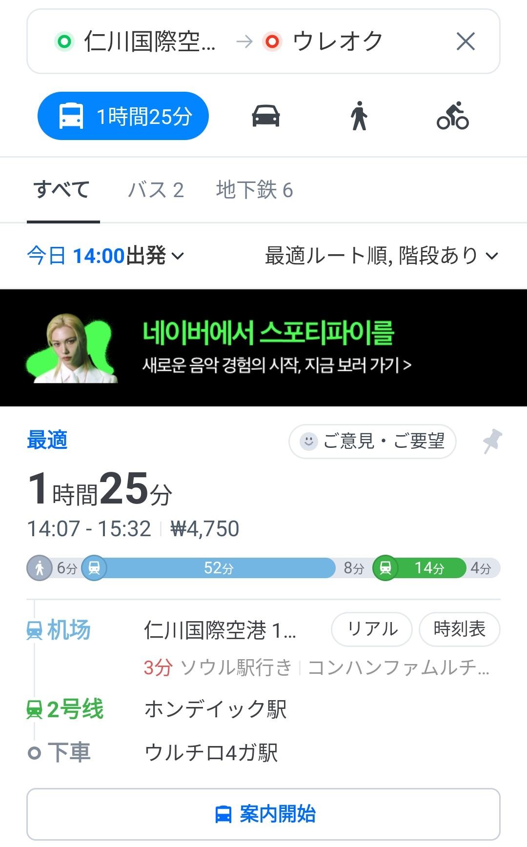 そこで、韓国の地図アプリ「NEVERマップ」で調べると、1時間25分のプランが表示された。韓国では、グーグルマップが使いづらい。Geminiはグーグルマップを基にプランニングしたはずだ。韓国に限っては店選びはGeminiを頼ってもいいが、アクセス方法は「NEVERマップ」の使用が最適解のようだ。