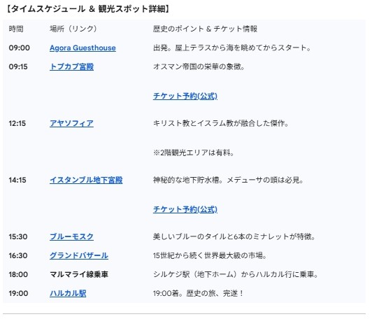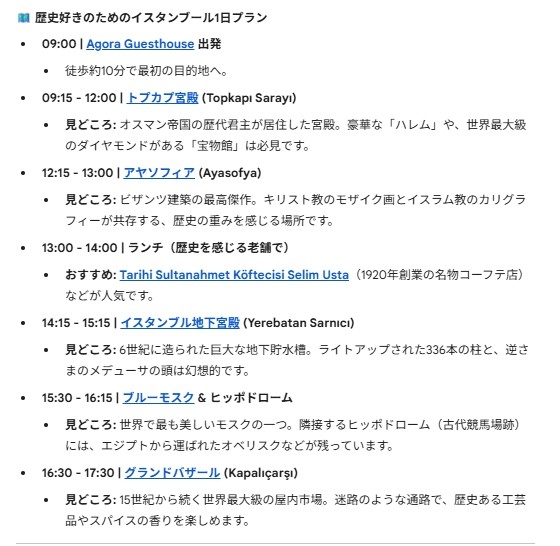 上記の条件の基、「Agora Guesthouseからスタートし、ハルカル駅に19時に着く。歴史好きのための1日、イスタンブール観光プランを考えて」という指示を送った。モードは「思考モード」にした。