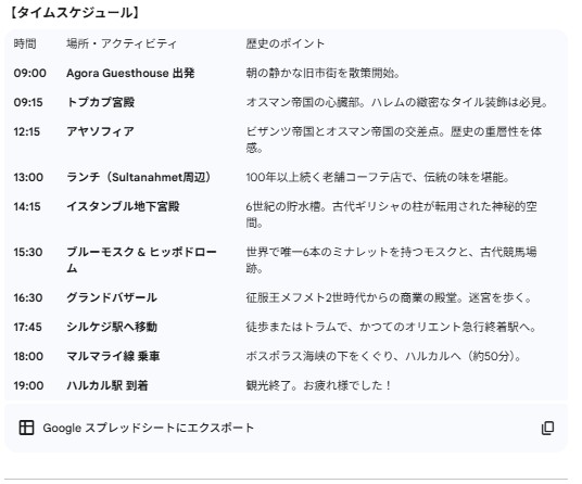 すると、数分で9時から19時までのプランを作成してくれた。トプカプ宮殿やアヤソフィアといった観光名所に加え、バザールもプランの中にある。また、昼食時のレストランの提案もあり、バランスの良いプランと言えよう。