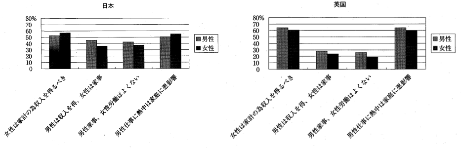 高市氏が衆議院議員選挙で初当選したのは1993年。男女雇用機会均等法の施行8年後の出来事です。ISSP(International Social Survey Programme)の1994年の調査を参照すると、当時の日本ではまだ「男性が社会、女性は家庭」という価値観が浸透していたことが読み取れます。