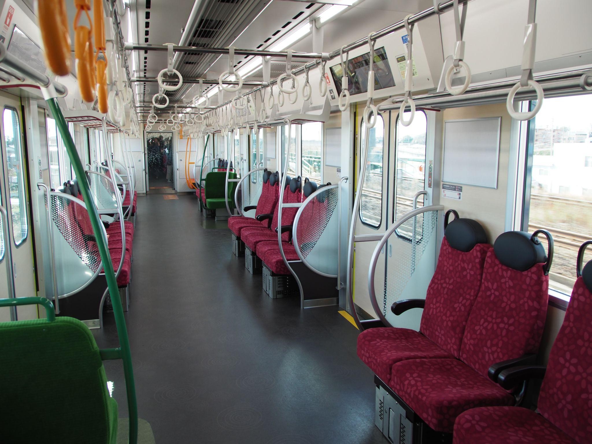 ロングシート時は6人掛けで、1人あたりの座面幅は従来のL/Cシートよりも10ミリ拡張した460ミリとなっている。また、座席のクッションも従来車両より柔らかくなり、座り心地が改善されている。