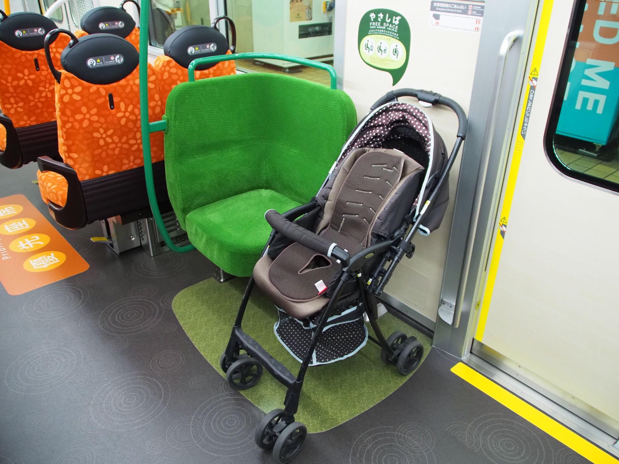 1A系の車内レイアウトで忘れてはならないのが、車両中央の扉付近に設置されたスペース「やさしば」だ。「やさしば」はベビーカーやキャリーケースを持った乗客を想定している。「やさしば」の床面にはストッパーがあり、キャリケースなどのタイヤをストッパーに入れることで、キャリーケースに手を掛けることなく座れる。