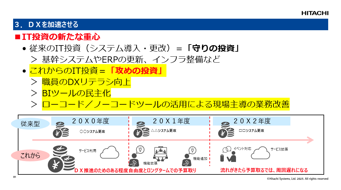 こうした姿勢でDXを加速させる視点として重要なのは「守りの投資」と「攻めの投資」の両立であり、柔軟な予算確保だとした。従来のシステム投資では、年度ごとに明確な目的を持って予算を確保するため、途中で変更することは難しい。しかし、技術革新のスピードに対応してDXを加速させるためには、柔軟性のある予算執行が欠かせないためだ。
