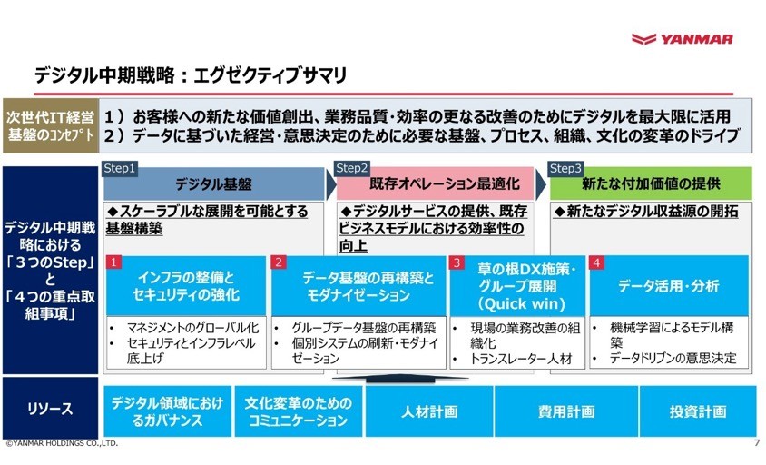 ヤンマーは、2022~2025年度で推進する「デジタル中期戦略」の中期戦略課題の1つに「DXに対応する次世代経営基盤の構築」を挙げている。その達成への道筋として「デジタル基盤の構築」「既存オペレーションの最適化」「新たな付加価値の提供」の3つのステップと、それを推進するための4本の柱を策定している。「草の根DX施策組織化・グループ展開」は3本目の柱に位置づけられ、草の根DXが現場から変革を促す重要な役割を担っていることが分かる。田中氏は、これまでの進捗についてこう語る。